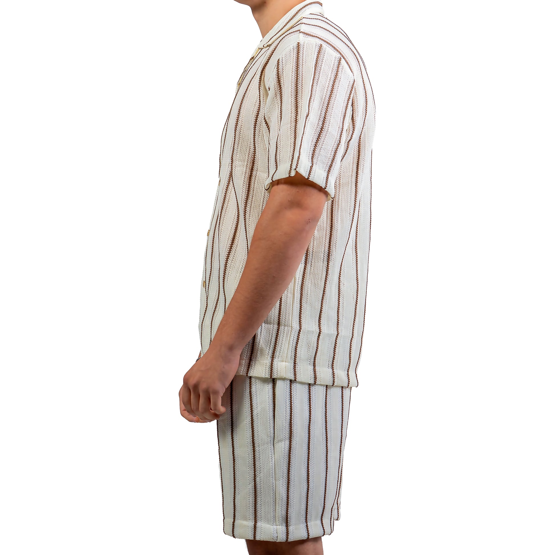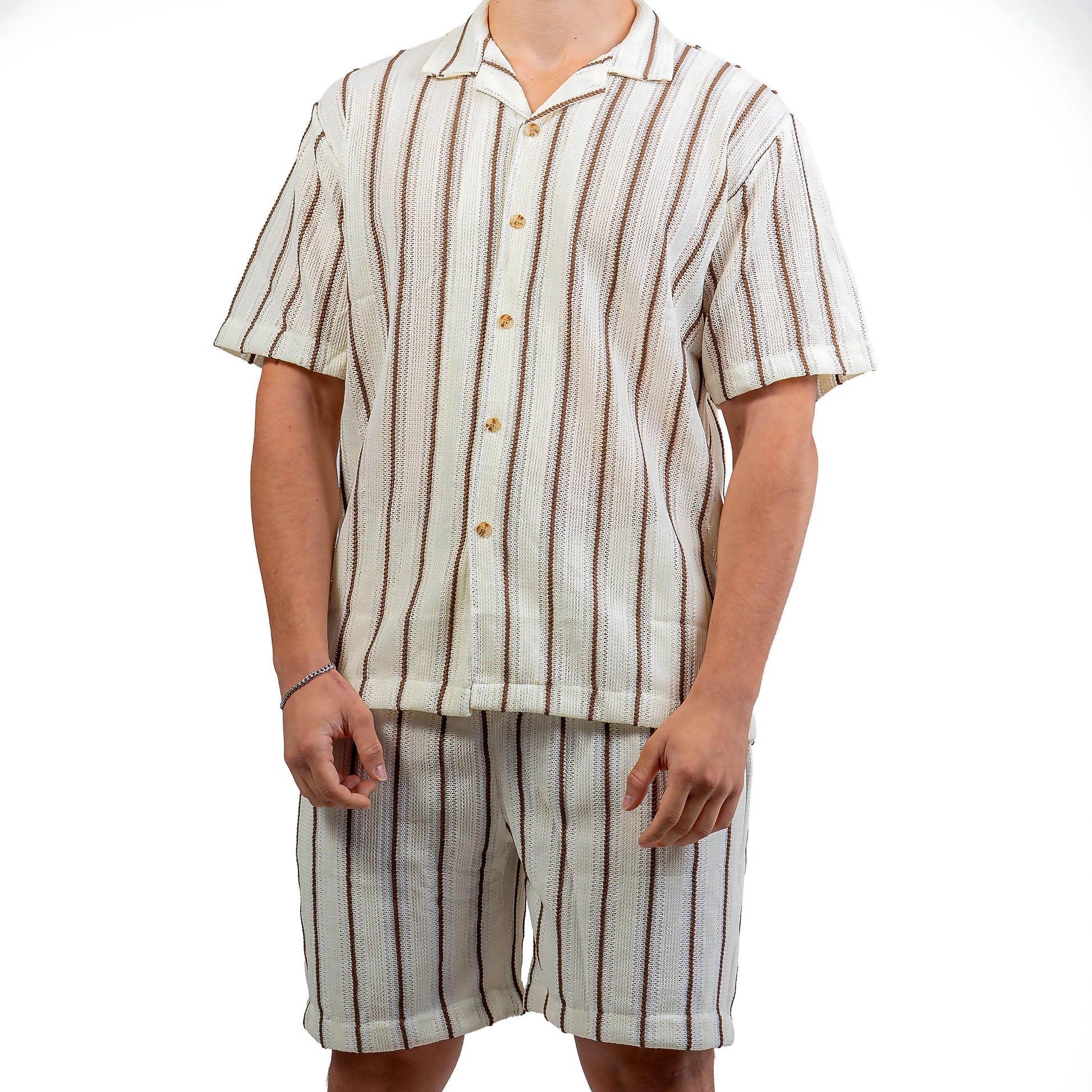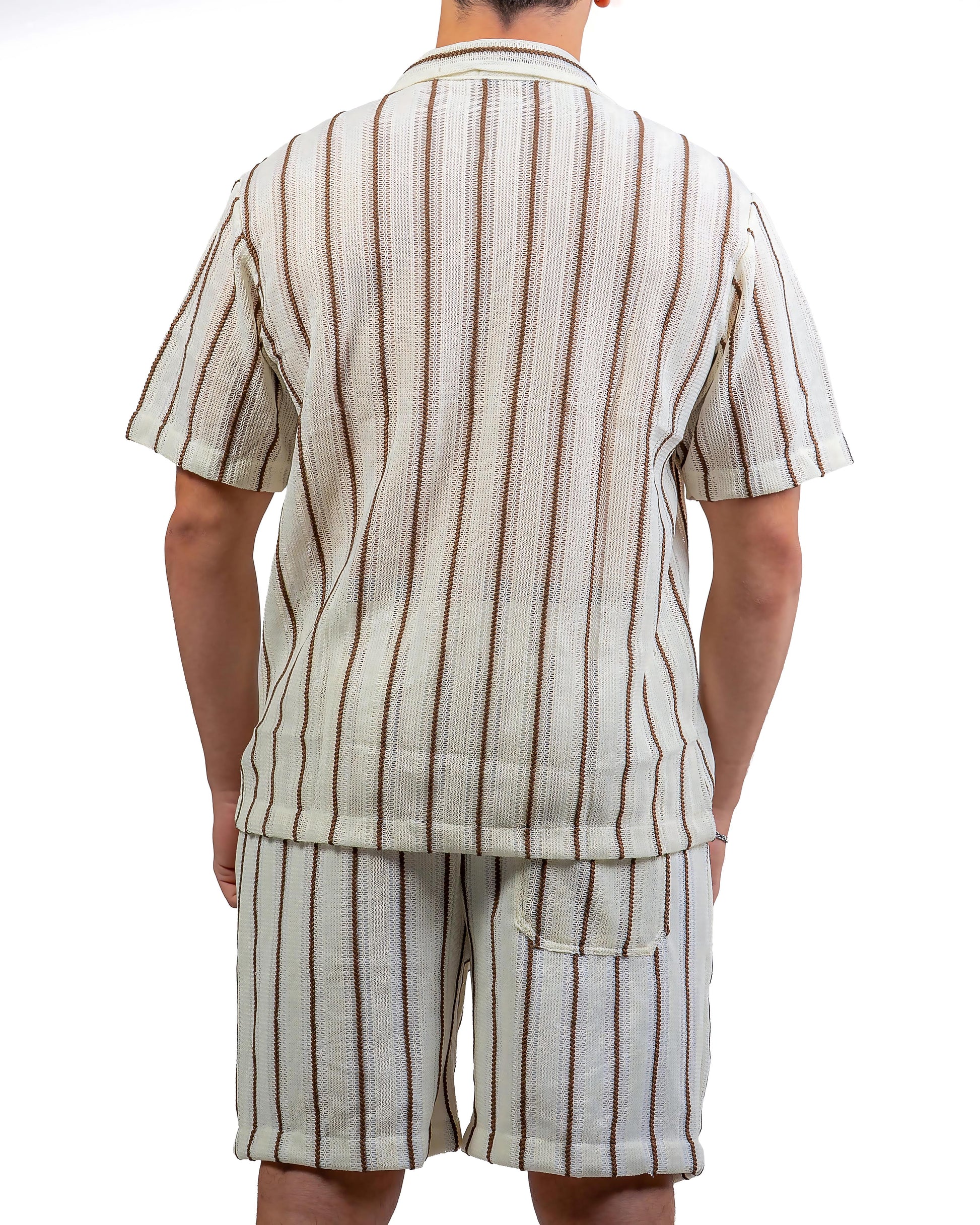 Cet ensemble ajouré rayé revisite les codes du vestiaire masculin avec une touche à la fois raffinée et estivale. Confectionné dans un tissu en coton ajouré respirant, il offre une sensation de légèreté incomparable, idéale pour les journées chaudes.